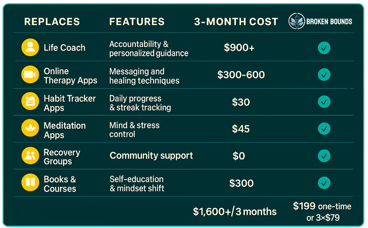 Broken Bounds isn’t just another bundle of "tips and tricks"—it’s a 90+-day path to permanent freedom. With science-backed strategies, deep emotional healing, and daily step-by-step guidance, you’ll finally have a clear way forward. No more guesswork. No more going it alone. Just real tools, real support, and real change—with a community walking beside you the whole way.